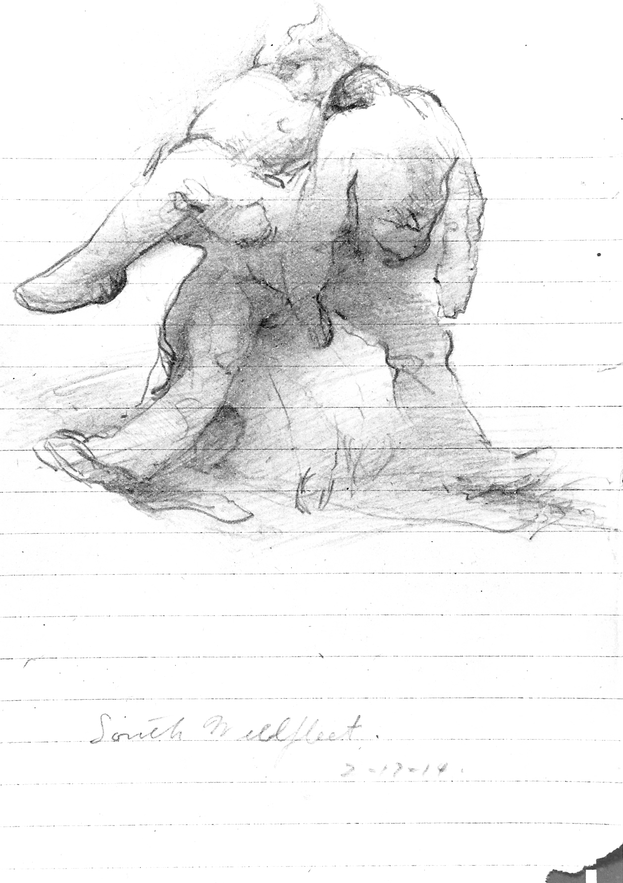 Drawn in South Wellfleet, MA. ED note on reverse: "Drawn The day of the loss of the `Castagna' 17 Feb. 1914 I was on the beach before sunrise & also Margaret Eckerson who took the photograph E W Dickinson Wellfleet 16 Sept 1950". Journal, September 6, 1950, "In the geology book which Mother gave to Father in 1888, I found a drawing marked '2 Feb 1914 South Wellfleet', the day of the loss of the 'Castagna'." [2-17-14 must be the correct date, HDB.]Provenance